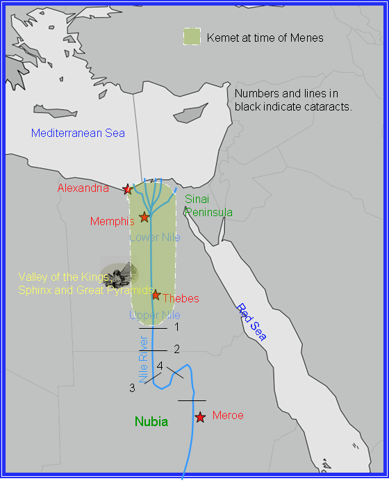 Until 3100, Kemet was divided into the Upper Nile and the Lower Nile. Enter Menes. He unified Kemet and created the first dynasty. About 500 years later, the Old Kingdom (2686-2181 BC) began. It featured a strong national government in Memphis and the construction of the great pyramids and the Sphinx. The Middle Kingdom (1991-1786) boasted the conquest of Nubia and trade with Syria, Palestine and Mesopotamia. The capital was Thebes. Then it collapsed and the Hyksos overran it. In 1550 BC, the native Egyptians won against the Hyksos. The New Kingdom (1570-1000) began. During the New Kingdom, the Egyptians dominated the area with the technology from the Hyksos. They conquered the Levant—all the way to the banks of the Euphrates. But conflicts with the Hittites led to the decline of the New Kingdom and Ancient Egypt.
