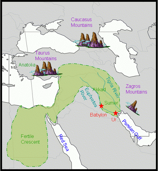 The young beast of civilization grew up in Mesopotamia. (Mesopotamia is a region, not a people or a nation.) At first, the Sumerians in the south were dominant, living in the fertile valley between the Tigris and Euphrates rivers. As time drew on, Sargon I (from the north) united Akkad and Sumer. Sargon’s Akkadians reigned for about 200 years, but they fell and a city-state known as Ur rose. But, another 200 years later, another state gained power under the city of Babylon. It was the first Babylonian empire. The Babylonian empire was the background for the rise of the first set of laws, compiled by Hammurabi. At around 1500 BC, the Hittites from Anatolia brought Babylonian power to an end.